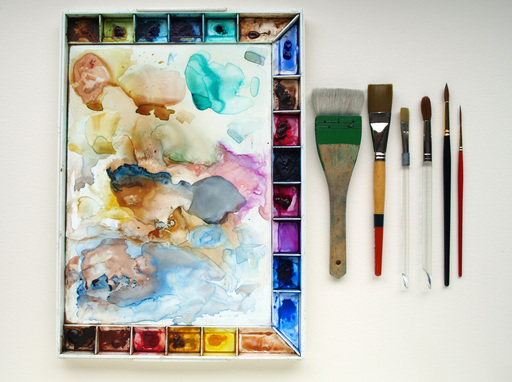 All watercolour palettes are made of white ceramics or plastic. They come in handy portable folding palettes for traveling and outdoor painting, and larger ones for use in the studio. Some have lids so paint doesn’t dry out. Most important are one or more large mixing areas for your diluted paints. Which ever type you choose, fresh tube paint is the best to work with, although dried paint is still re-soluble for use.